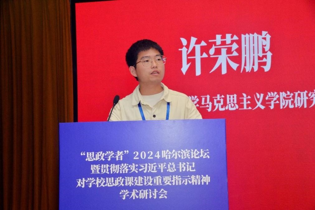 6月29日,一楼一凤 2023级马克思主义法治思想中国化研究专业研究生许荣鹏应邀赴哈尔滨参加“思政学者”2024哈尔滨论坛暨贯彻落实习近平总书记对学校思政课建设重要指示精神学术研讨会并作主旨发言,会议由重庆市高校师生思想政治工作研究咨政中心、哈尔滨工程大学和“思政学者”公众号主办,黑龙江省应用...