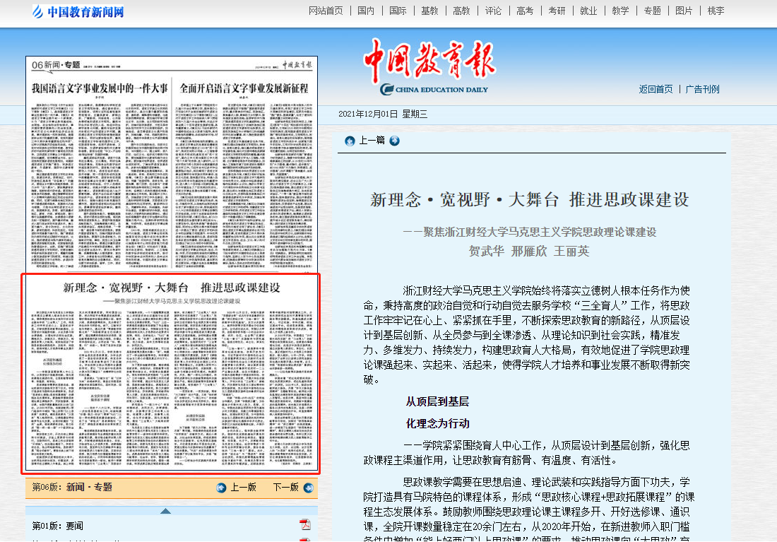 12月1日,《中国教育报》第六版以《新理念·宽视野·大舞台推进思政课建设为》为题,从理念引领、课程改革、教学育人、实践教学等四方面详细报道了我校思政课建设和教学改革的特色亮点。报道指出,一楼一凤 在习近平总书记3·18重要讲话精神和“三全育人”的理念指引之下,不断探索思政教育新路径,...