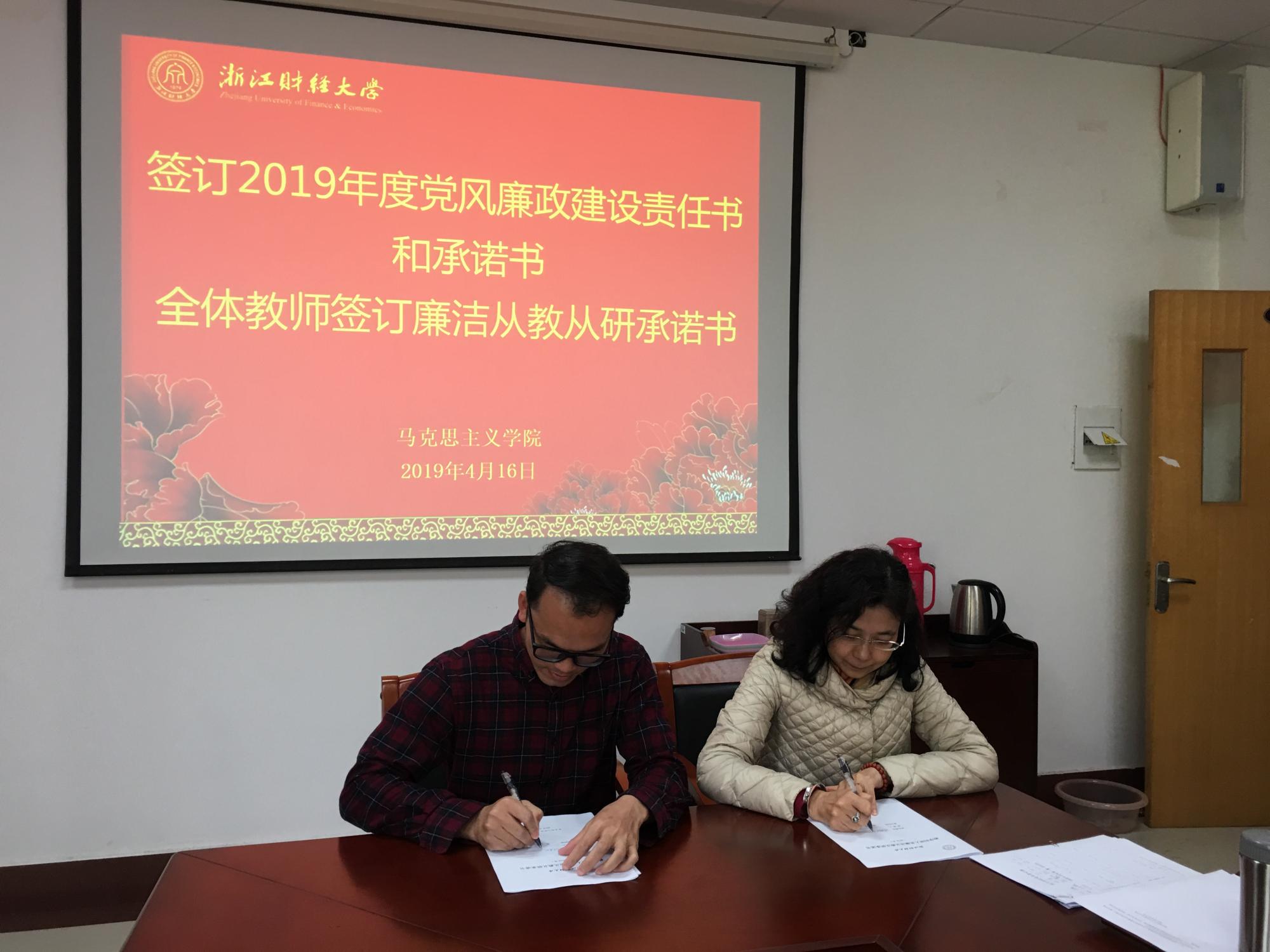 教学科研人员廉洁从教从研承诺书》。学院中层干部签订了廉洁自律承诺书,全体教师签订了廉洁从教从研承诺书。