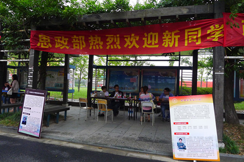 尽管天公不作美,寒风阴雨,却丝毫没有影响迎新师生们的工作效率和热情,横幅、标语、宣传板都已经细心地准备妥当,周密的计划,细密的分工,我们满怀热情,充满无限期待,盼望着新生的出现。在等待中,新生们陆陆续续地来到报名现场,我们热情地接待了他们,温柔的话语,亲切的问候,当新生同学有问题时,服务的同学都耐心地为新生解答问题,展示了我部良好的精神风貌。