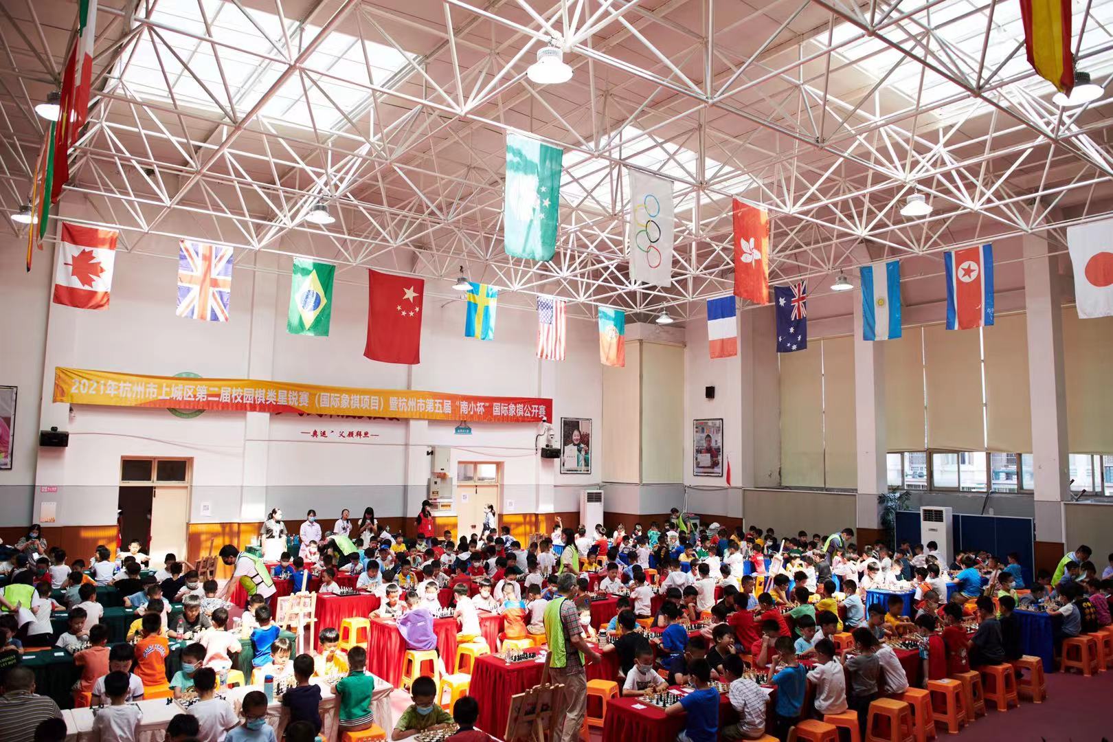 青年志愿者协会的志愿者们在早上7点55分准时到达杭州市南肖埠小学,展开了“全国百城千县万乡全民棋牌推广工程”2021年杭州市上城区第二届校园棋类星锐赛(国际象棋项目)暨杭州市第五届“南小杯”国际象棋公开赛志愿活动。