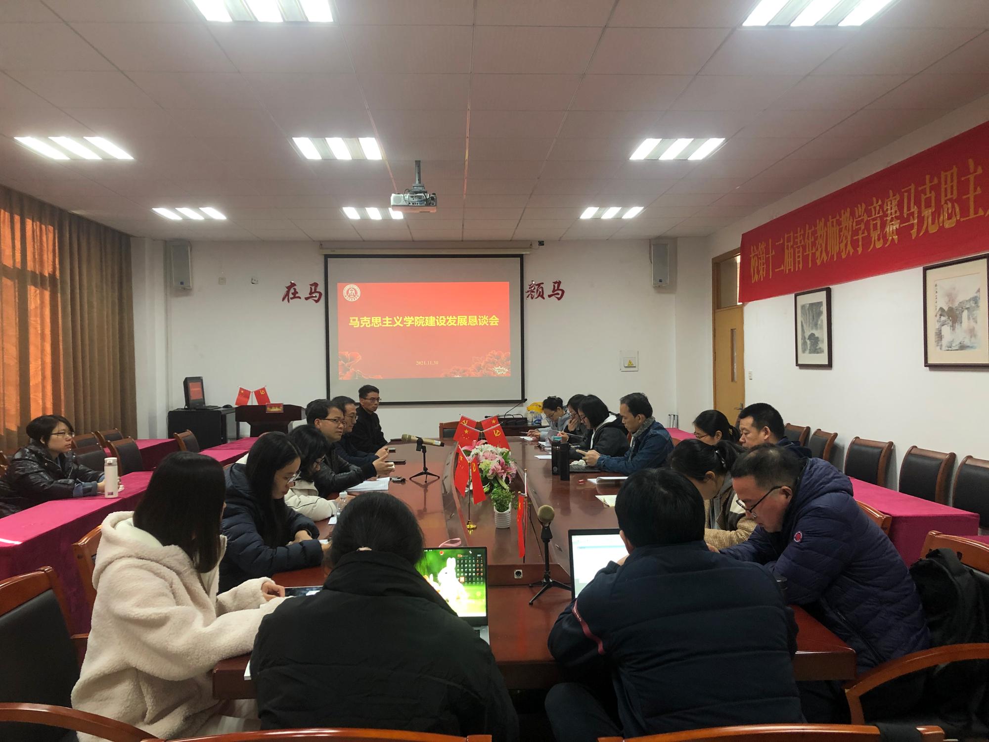 建设的意见》以及学院新一届班子履职过半之际,11月30日下午,学院在211会议室召开学院建设发展恳谈会。会议由学院党委书记、院长贺武华主持,副书记、副院长刘向前、副院长邢雁欣、教授代表、学院两委委员、工会委员、新进教师代表、全体行政人员20余人参加。