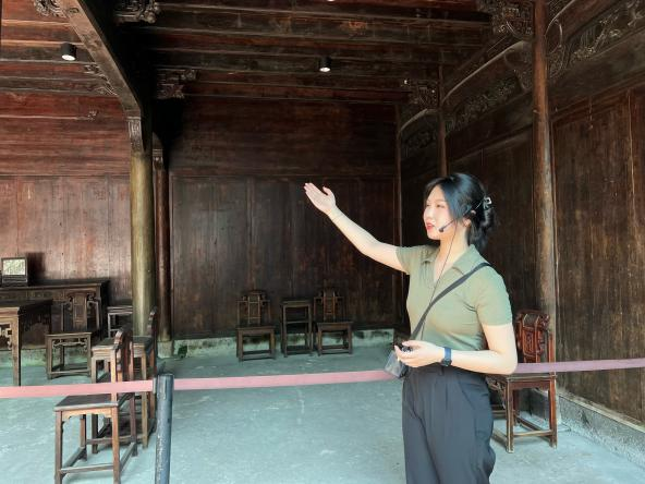 参观学习后,望道展示馆的讲解负责人对两位党员代表进行了初步的培训,在跟随正式讲解员带团一天后,两位同学带齐了扩音器,在陈望道故居开始了讲解员的工作。