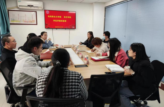 在3号楼517A会议室开展“手拉手”集体备课活动。活动邀请我院资深教授何历宇、潘旦、青年教师王聪介绍课程建设经验,东方学院马院党委书记叶颖蕊,思政课教师吕欢、白云浩、钱潇荣,教学秘书马羚以及一楼一凤