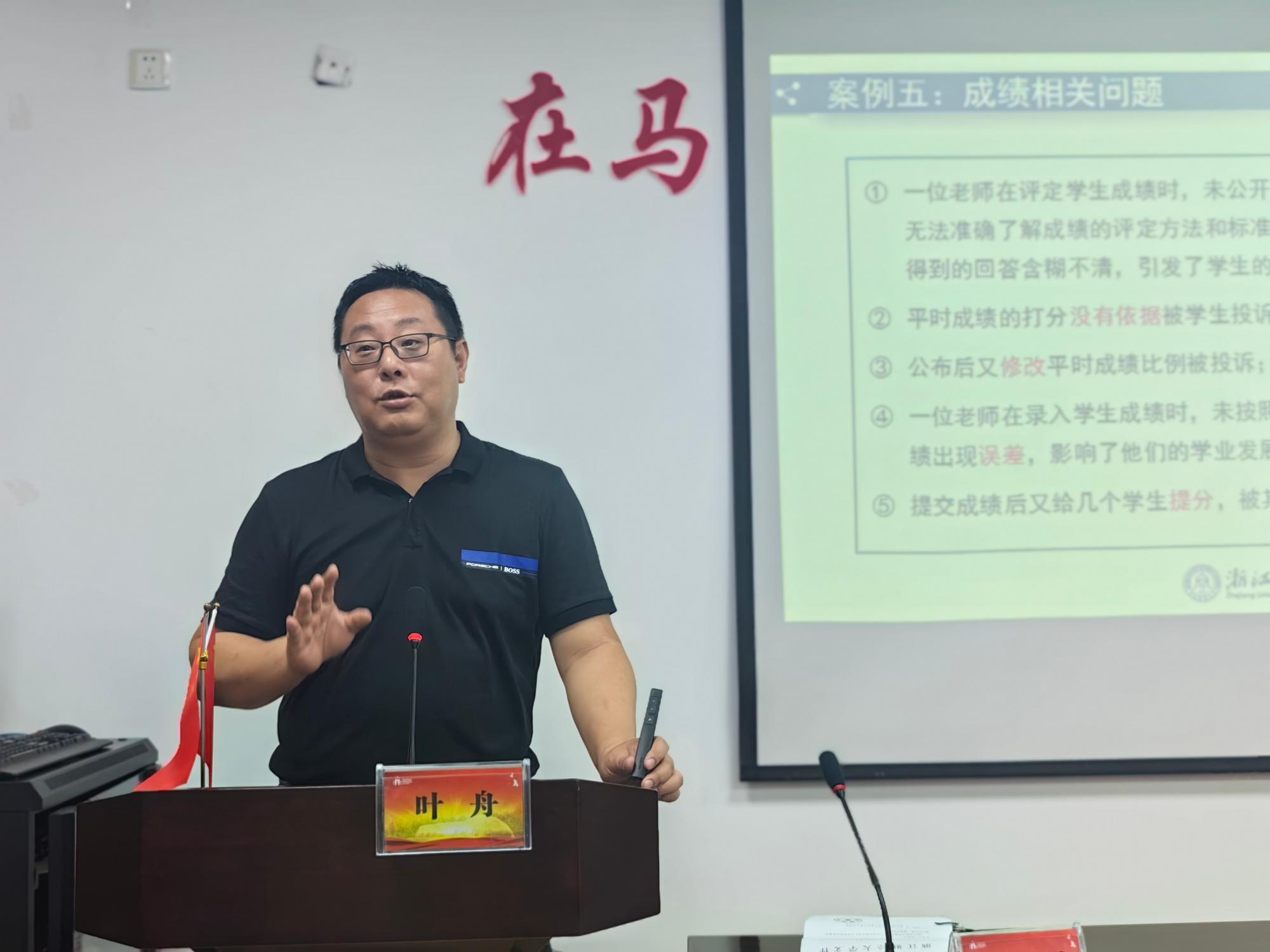 作题为“教学工作规范与教学事故防范”的培训会。叶舟围绕“课堂教学注意事项”“教师监考注意事项”“教师言行注意事项”三个方面就我校教学规范和本科教学质量提升进行讲解。叶舟以案说理,结合《一楼一凤