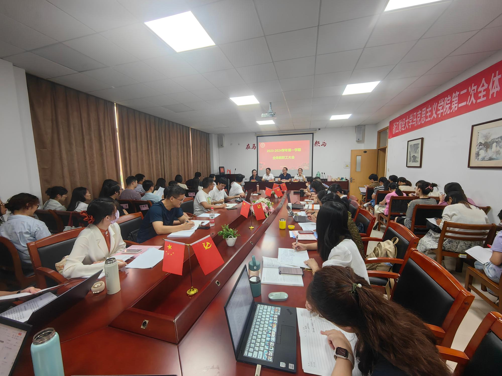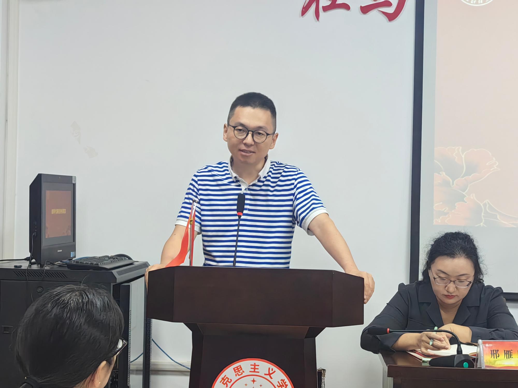 学院领导班子成员依次部署新学期工作。首先,学院党委书记刘向前带领全体教师开展政治理论学习;总结了今年以来学院在主题教育、党建共建等方面取得的成果;通报了学习强国先进集体和先进个人荣誉获奖情况;传达部署了巡察工作的要求。随后副院长、纪委书记邢雁欣就思政课教学质量建设提出要求,并传达部署了“廉政档案”工作。最后学院院长助理潘旦布置学科点申报工作。