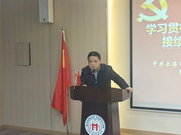 杨俊教授以《深入学习贯彻党的二十届四中全会精神 接续推进中国式现代化》为题作专题辅导。杨俊教授长期深耕党史党建研究,他从理论与实践三个维度展开深入解读。在理论层面,他系统梳理了全会精神与中国共产党奋斗纲领的内在逻辑,强调全会提出的发展理念是马克思主义在新时代的丰富与发展;在实践层面,他结合高校马克思主义理论教育的特点,剖析了全会精神对思政课改革创新的指导价值,建议一楼一凤