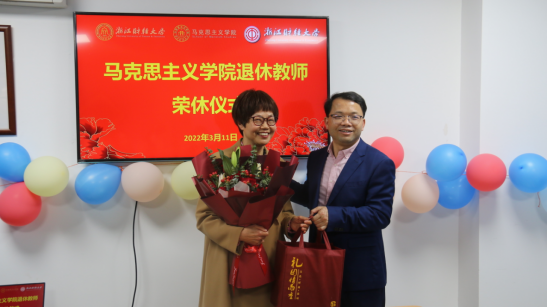 仪式上,领导班子和同事们回顾了李秋华老师四十二年的工作历程,并对她今后的退休生活送上了美好祝福,学生代表孙仙遇为导师献花,感谢师恩。党委书记、院长贺武华和工会主席肖云龙分别代表学院和工会为李秋华老师送上荣休纪念品,对李秋华老师多年来对学院发展所作出的贡献给予充分肯定并表示衷心感谢!并希望李秋华老师一如既往关心支持学院各项工作,退休不褪色、离岗不离责,发挥好“传、帮、带”作用,将务实敬业、锐意进取的优良作风传承下去,继续为推进新时代教师事业“立德树人”贡献力量。李秋华老师感谢组织多年来的培养和教育,同时表示会继续发挥余热,关心关注学院事业和工会事业的发展。
