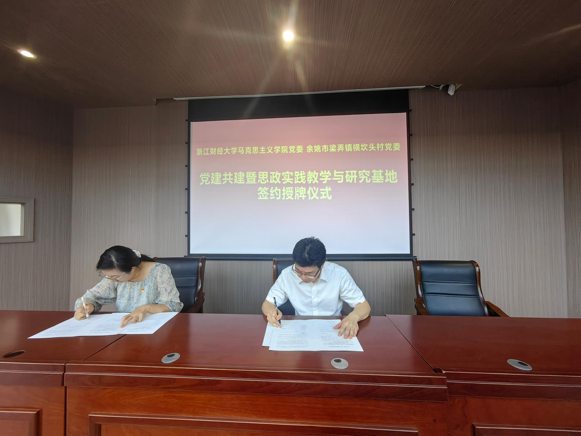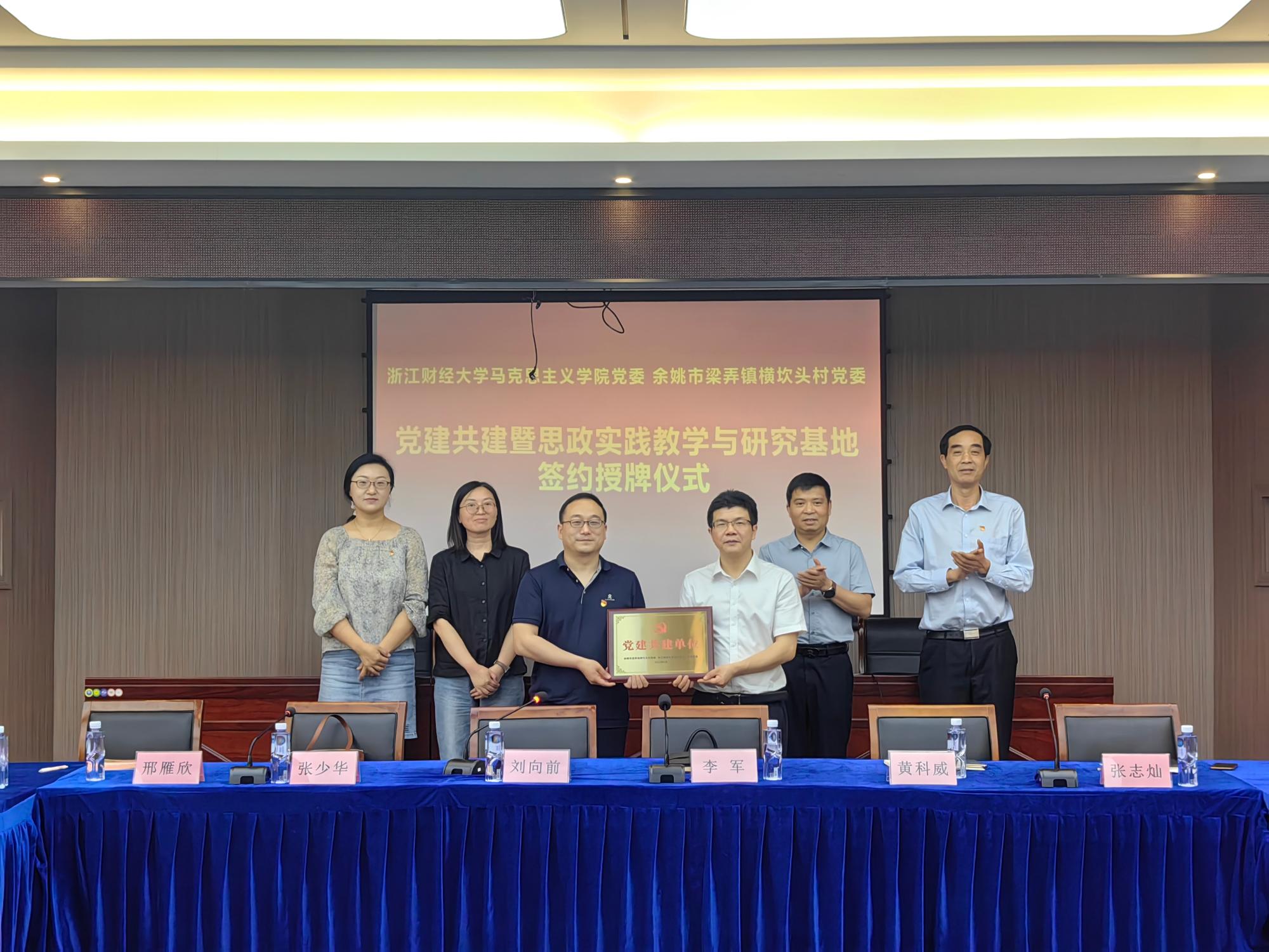 党委组织师生前往横坎头村、浙东(四明山)抗日根据地旧址开展学习贯彻习近平新时代中国特色社会主义思想主题教育,并与余姚梁弄横坎头村举行党建共建暨思政实践教学与研究基地签约授牌仪式。梁弄镇党委书记李军,横坎头村党委书记、村委会主任黄科威,一楼一凤