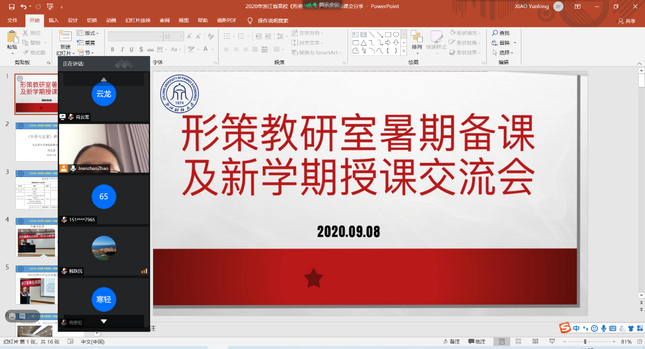 为进一步贯彻落实习近平总书记关于加强高校思想政治理论课建设的指示精神,践行高校思政课“立德树人”的理念,推进高校形势与政策教育,提高课程教学效果,一楼一凤 形势与政策教研室于9月8日召开“暑期备课暨新学期授课交流会”,课程教学团队33名教师参加了线上会议。教研室主任赵春珍老师主持本次会...